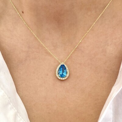 Round 2 ct Blue Topaz, Halo Diamond Necklace